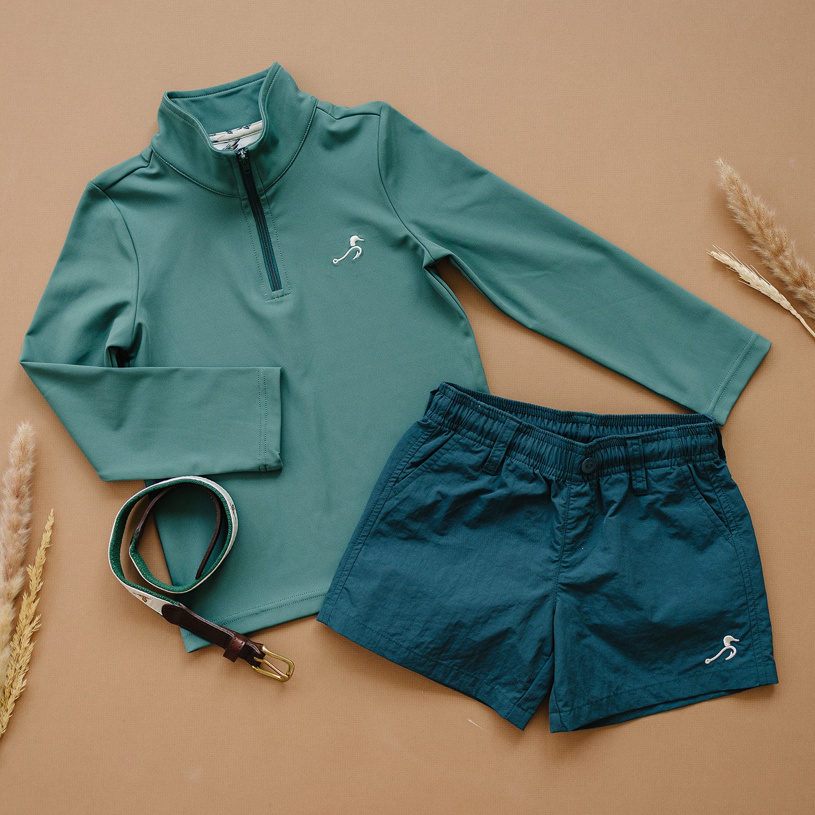 Built for cool mornings and sunny afternoons, the Beau Quarter Zip is a lightweight performance layer crafted with UPF 50+ sun protection and breathable comfort. A tagless design and stand collar ensure all day comfort. Made in mallard green, this pullover is perfect for layering on outdoor adventures. It keeps your little guy protected, comfortable, and ready for whatever the day brings. Features 'mallard sky' mallard print at inner collar.