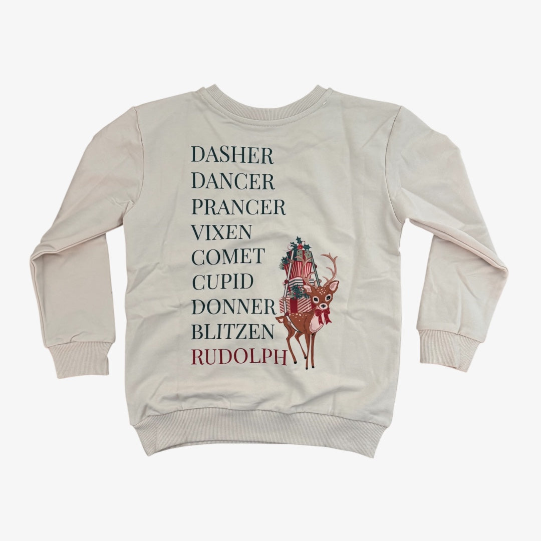 Our classic french terry pullover with retro reindeer on front and reindeer names on the back.