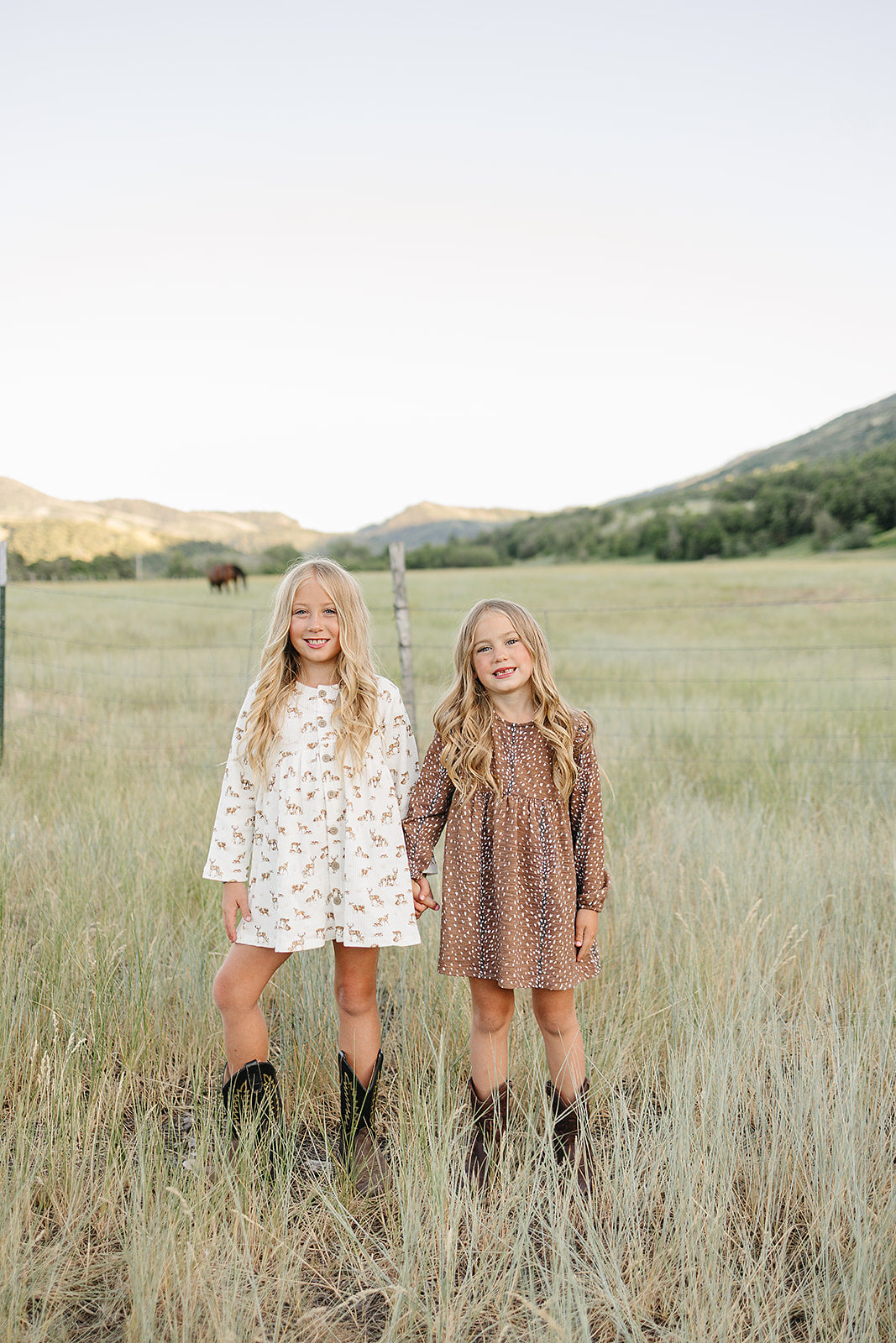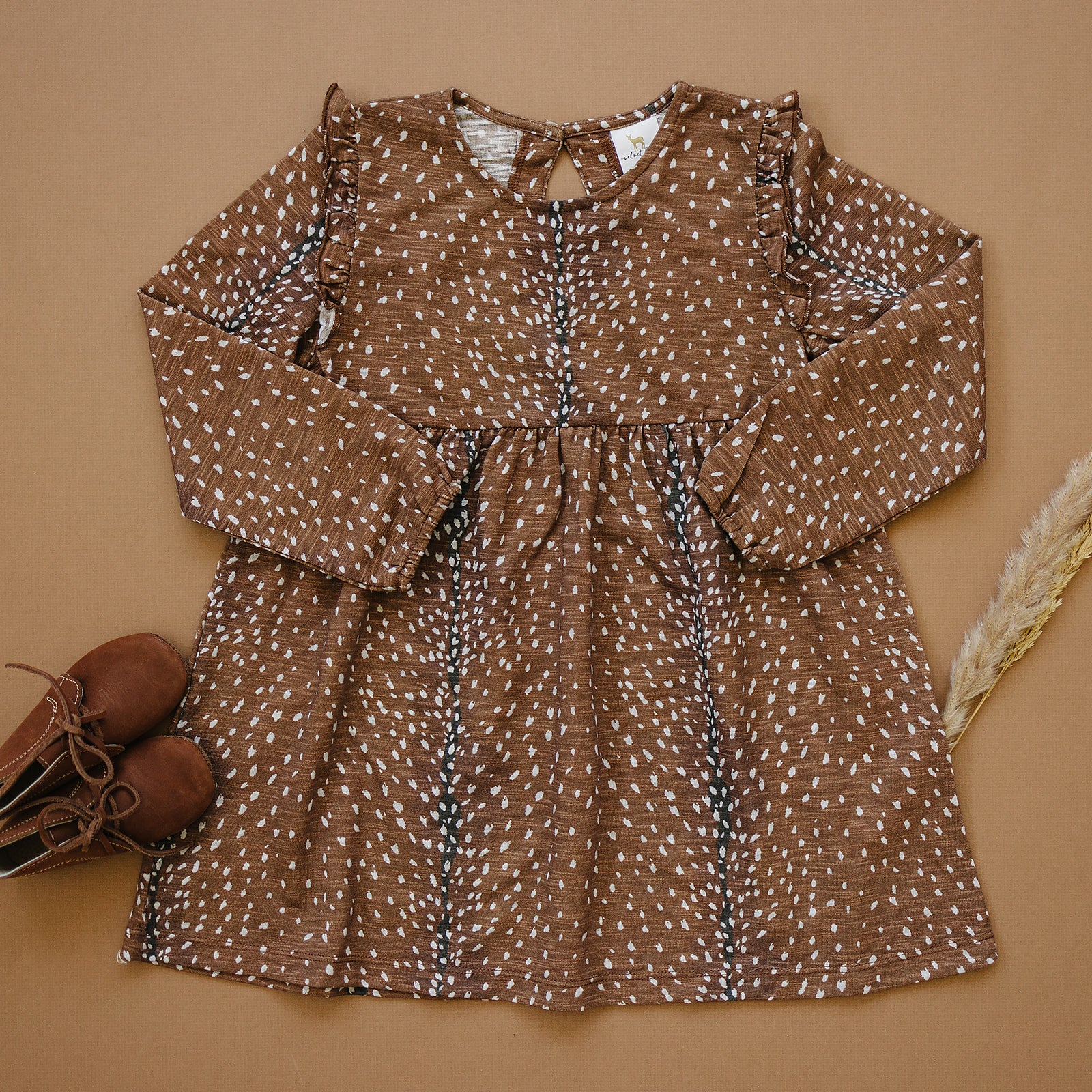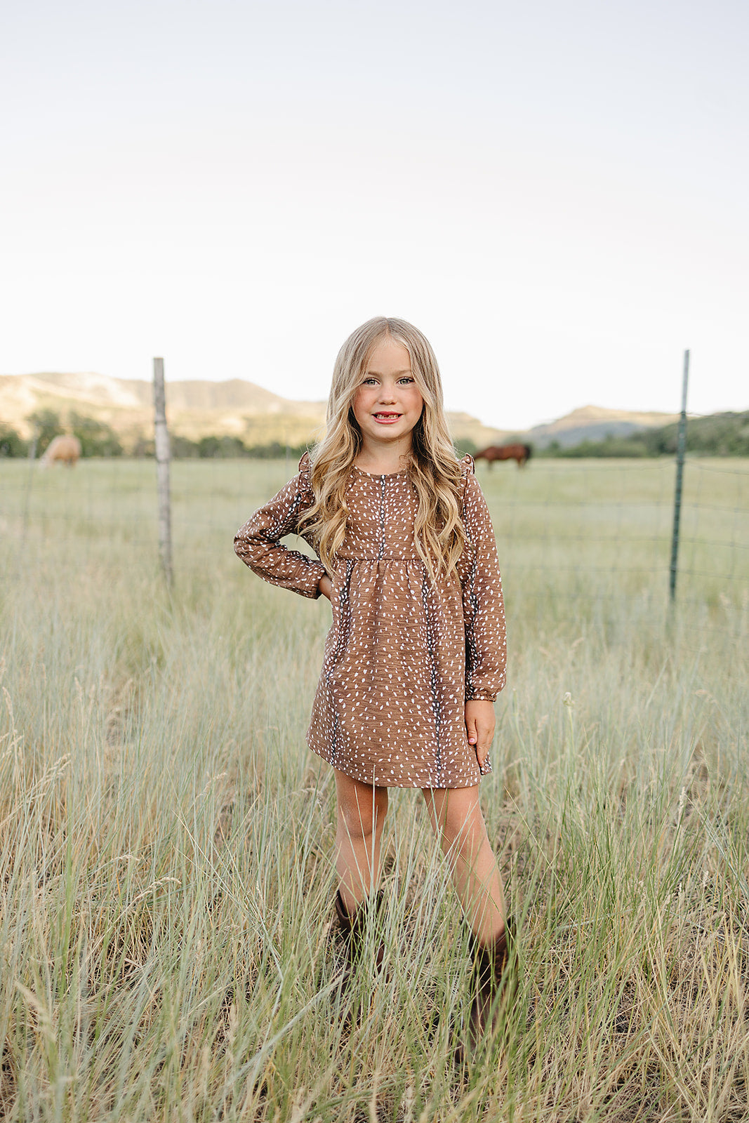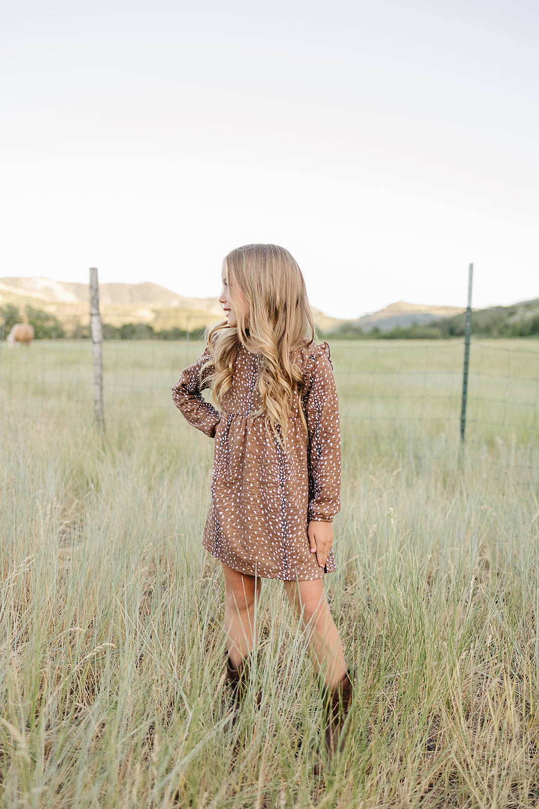The Cora Dress- a delightful blend of modern flair and timeless charm. This long sleeve dress with ruffle detail adds a touch of western elegance to your little one's wardrobe. In our 'fawning over you' all over axis print.