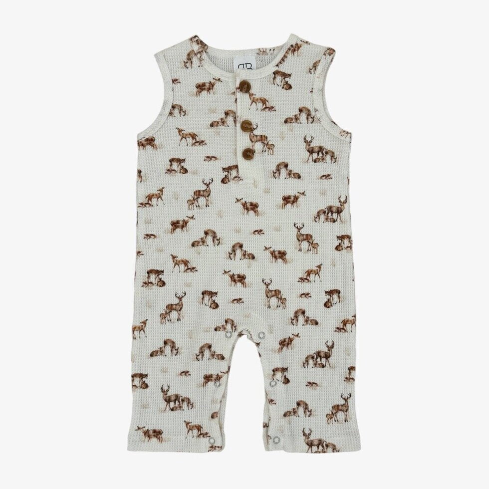 Cruz jumper with buttons at front and metal snaps at stride. Featuring our woodland deer print.