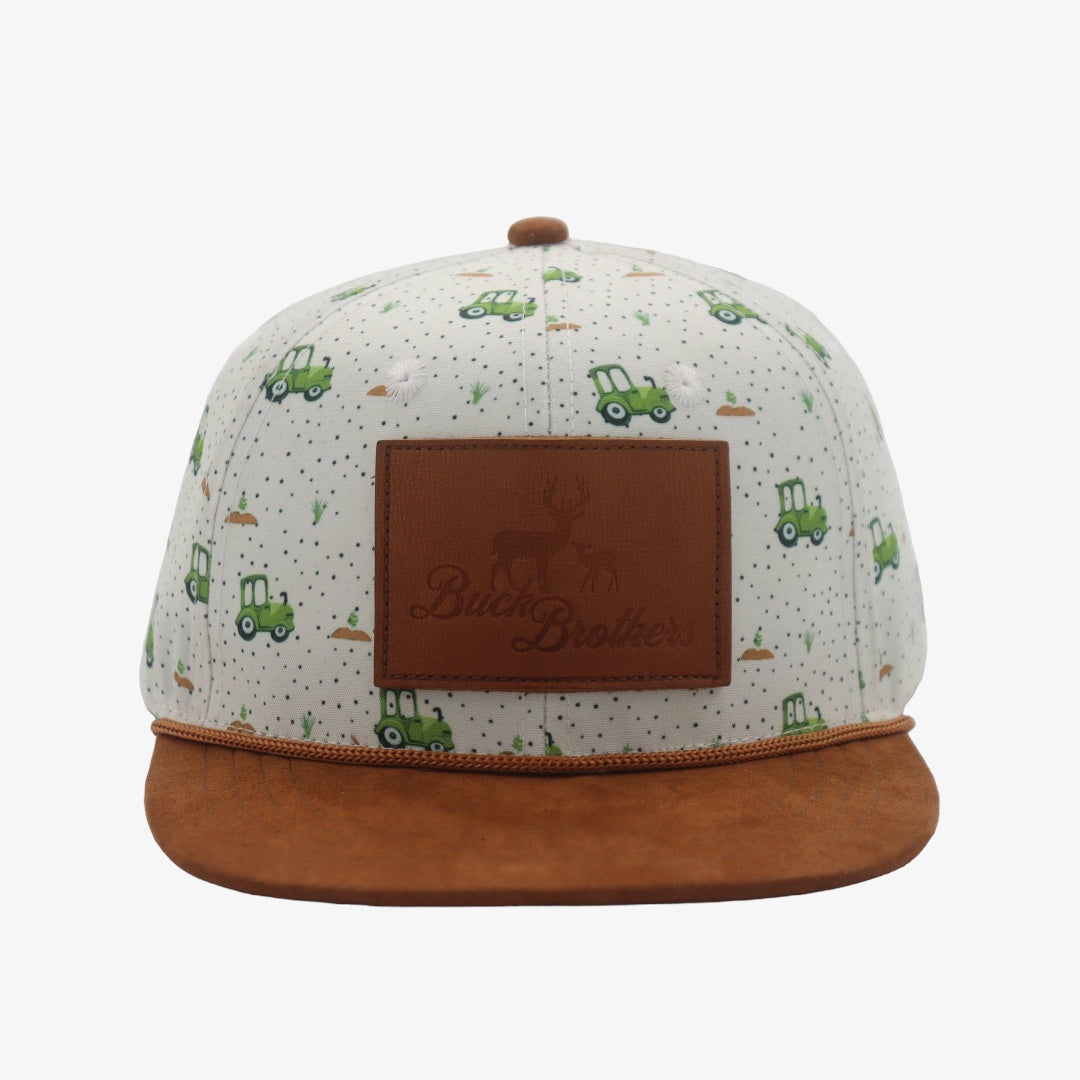 Explore the countryside in style with our green tractor print hat! The suede flat brim provides a contemporary edge, while the Buck Brothers leather logo patch adds a touch of rugged charm. Perfect for outdoor enthusiasts!