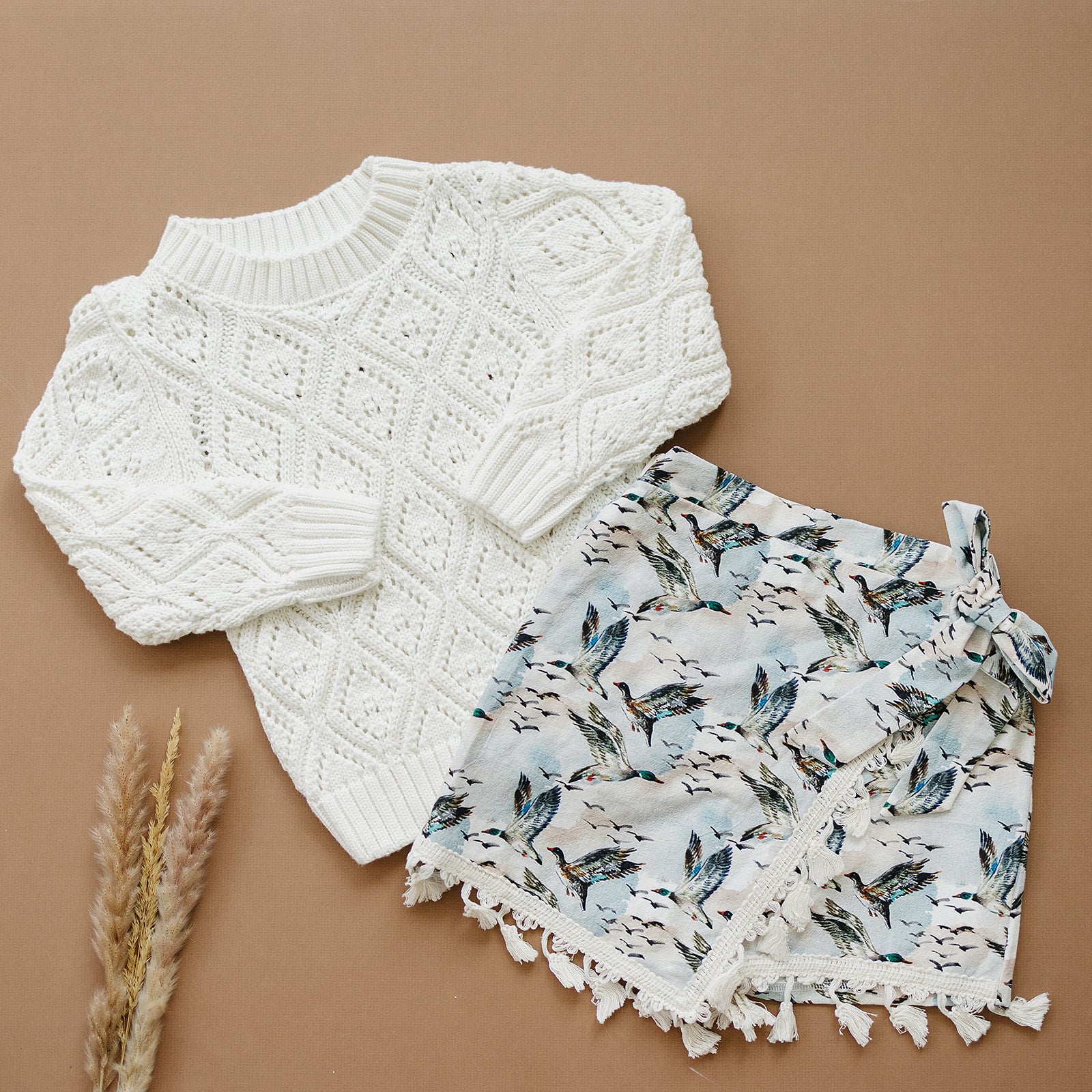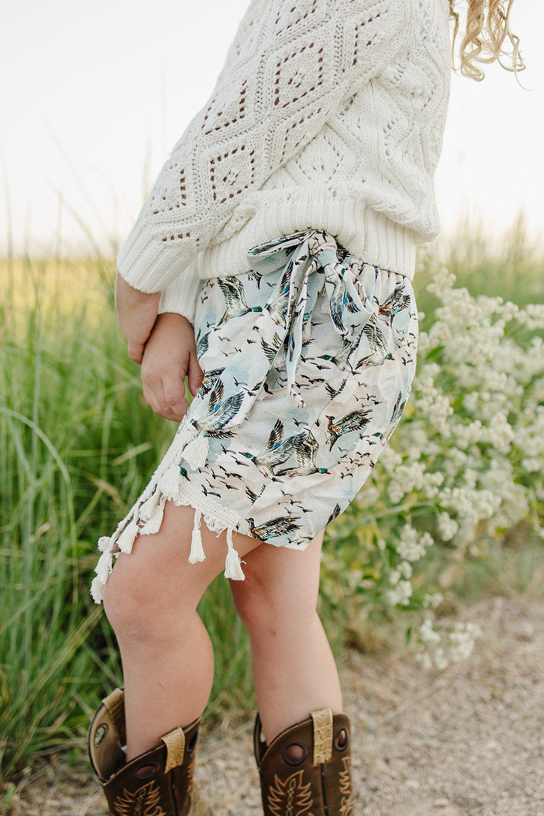 A twirl worthy staple with a wild side! The Hassie Skort blends the charm of a wrap skort with the comfort of built in shorts. Perfect for school, play dates, outdoor adventures and more. Featuring a side functional tie and tassel trim.