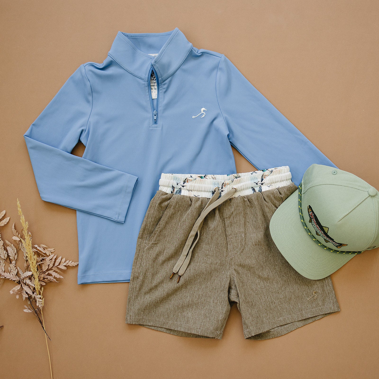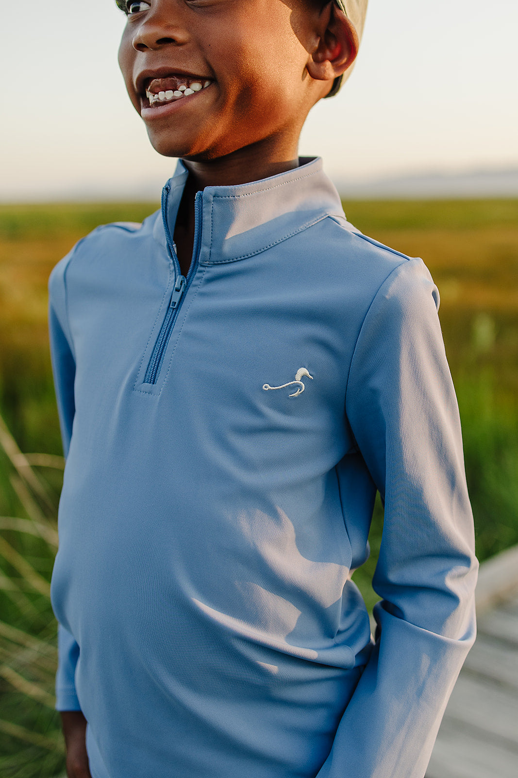 Built for cool mornings and sunny afternoons, the Beau Quarter Zip is a lightweight performance layer crafted with UPF 50+ protection and breathable comfort. Made in lake blue, this pullover is perfect for layering on outdoor adventures. It keeps your little guy protected, comfortable, and ready for whatever the day brings. Features 'wild horses' horse print at inner collar.