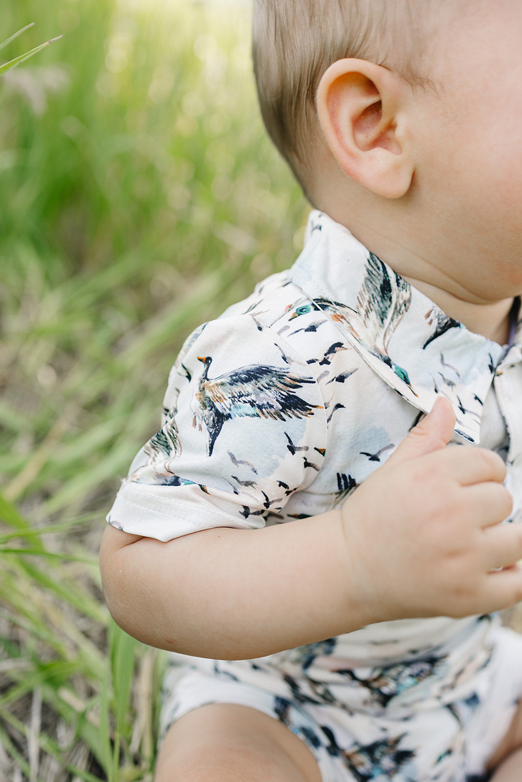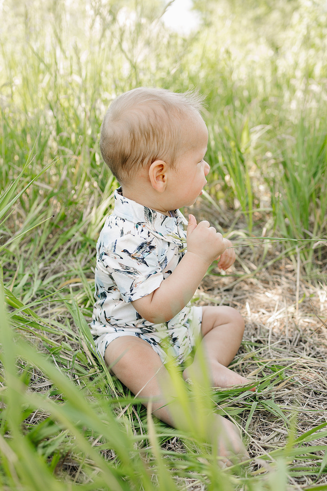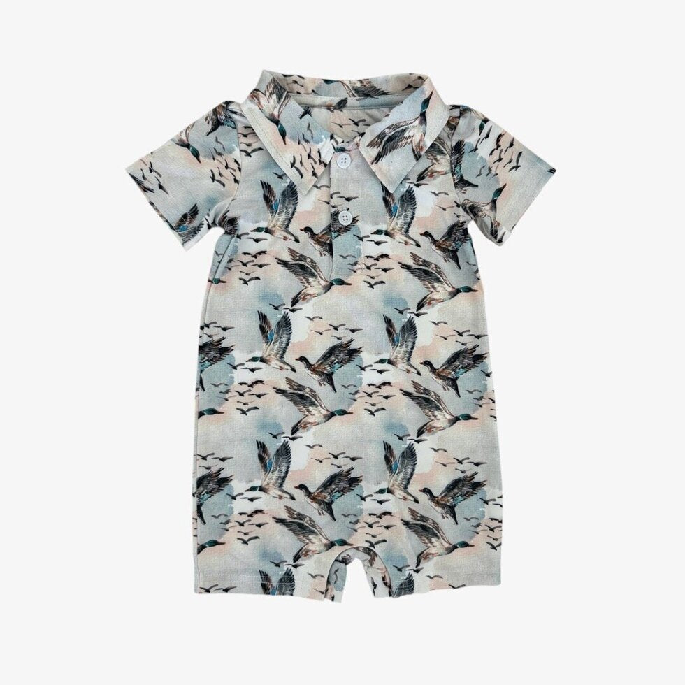 Made for sunshine and southern adventures, this baby boy jumper is crafted from lightweight, breathable, and packed with UPF 50+ sun protection. Featuring our 'mallard sky' all over mallard print, this short sleeve one piece keeps your little guy cool, covered and comfortable from backyard hangs to boat days.