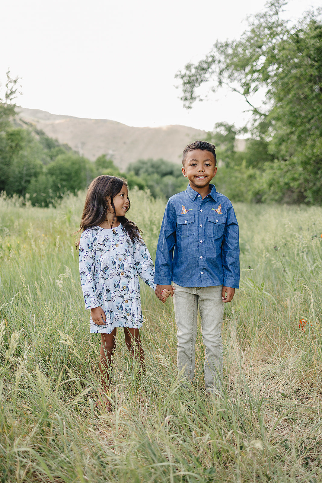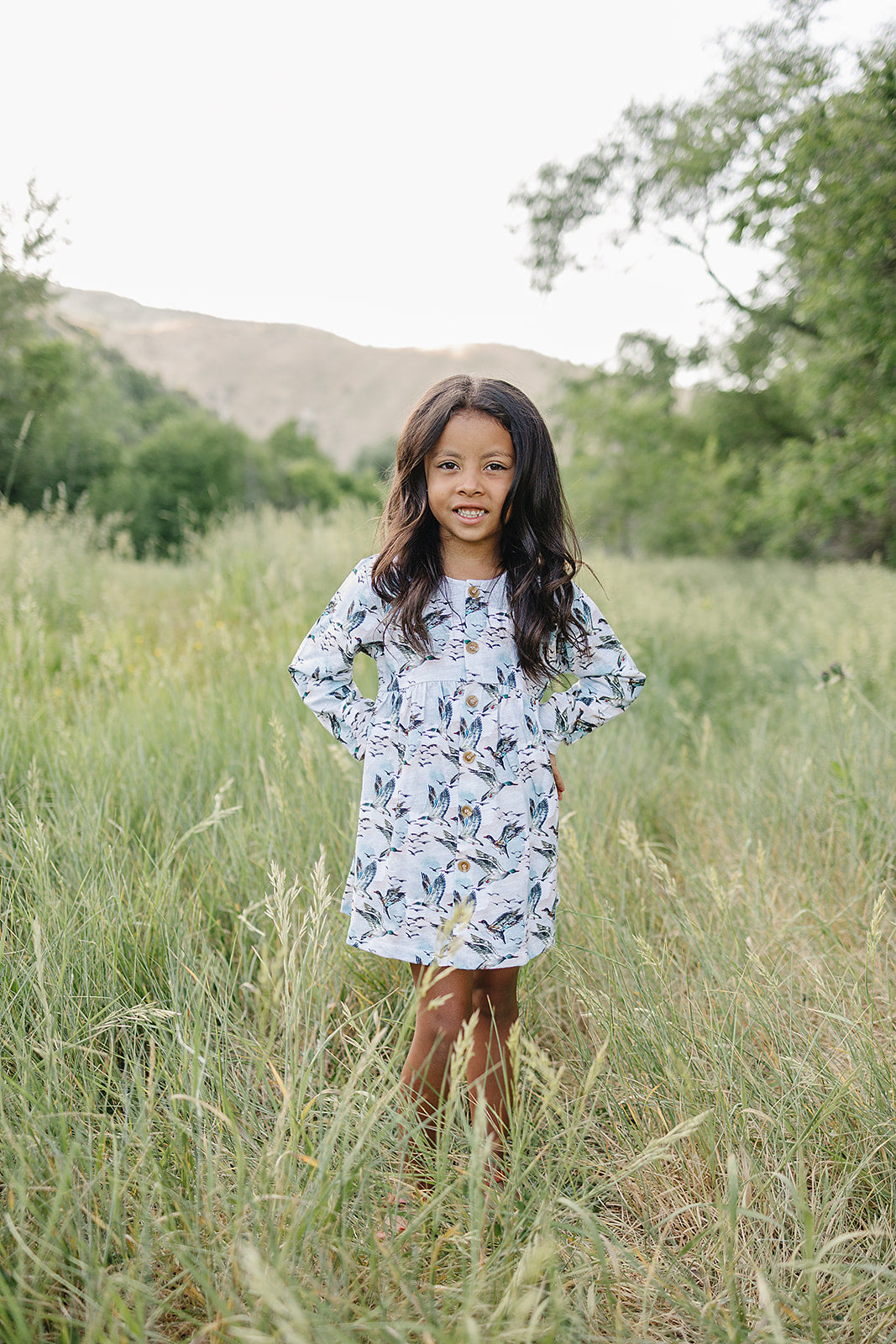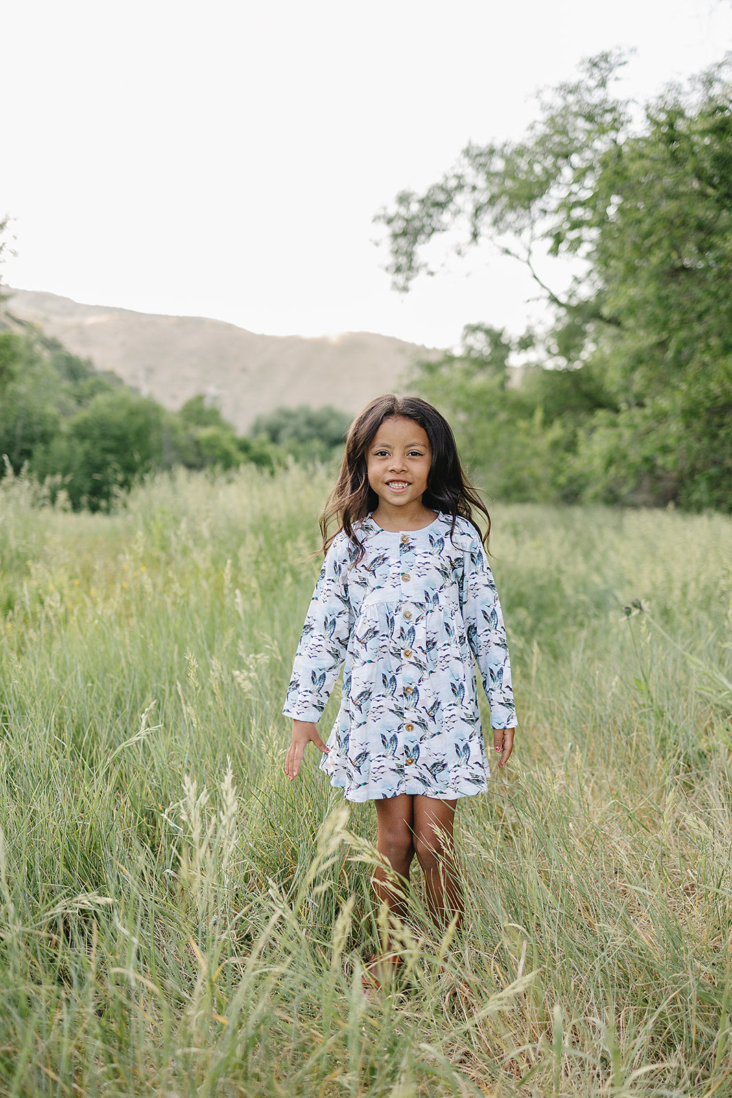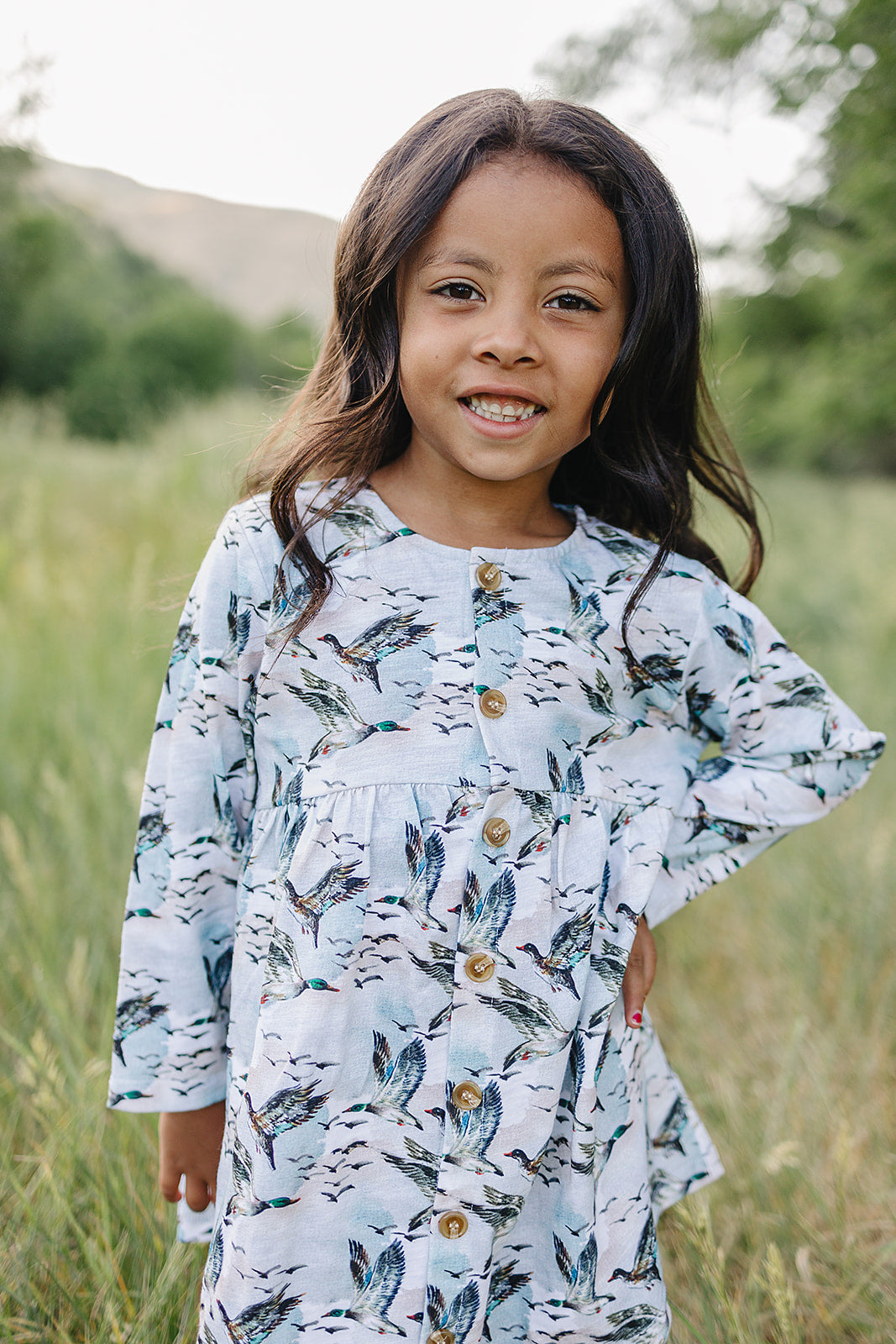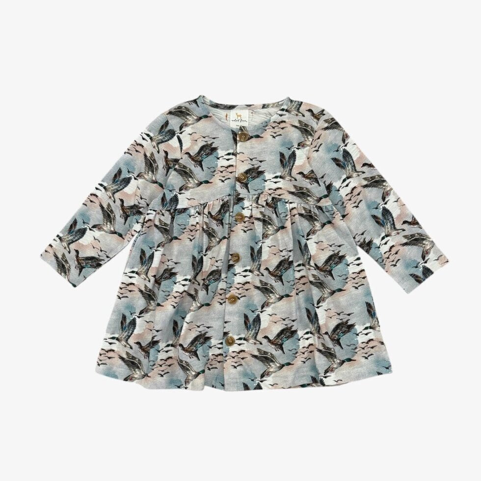 The Mabel Dress- a delightful blend of modern flair and timeless charm. This long sleeve dress with buttons down the front add and comfort elegance to your little one's wardrobe. In our 'mallard sky' all over mallard print.
