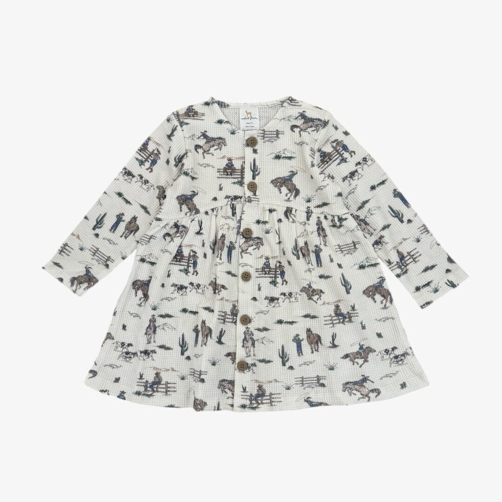 The Mabel Dress- a delightful blend of modern flair and timeless charm. This long sleeve dress with buttons down the front add and comfort elegance to your little one's wardrobe. In our 'ranch' all over ranch print.