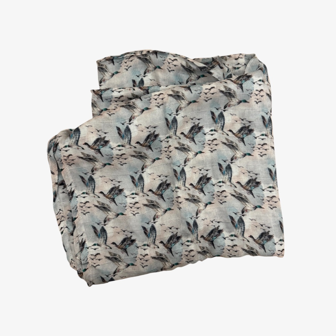 Muslin Swaddle - a perfect blend of comfort and style for your little one. Crafted from soft, breathable muslin fabric, this swaddle provides a cozy cocoon. In our 'mallard sky' mallard print, it adds a touch of playfulness to your nursery.