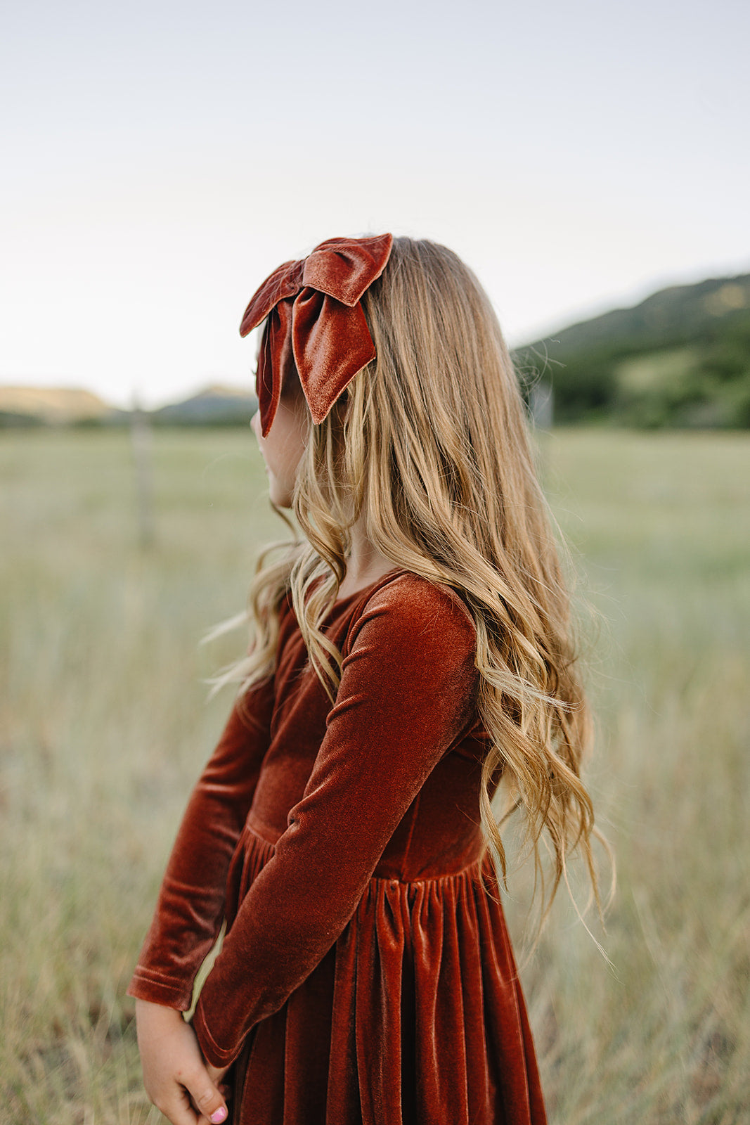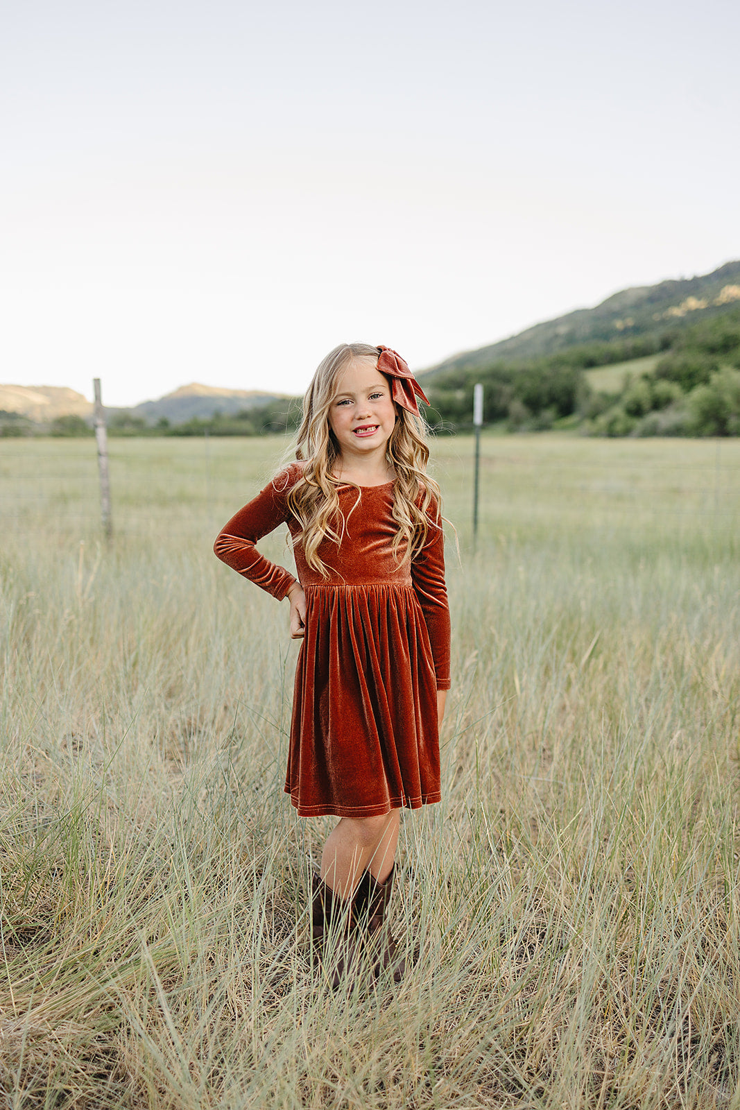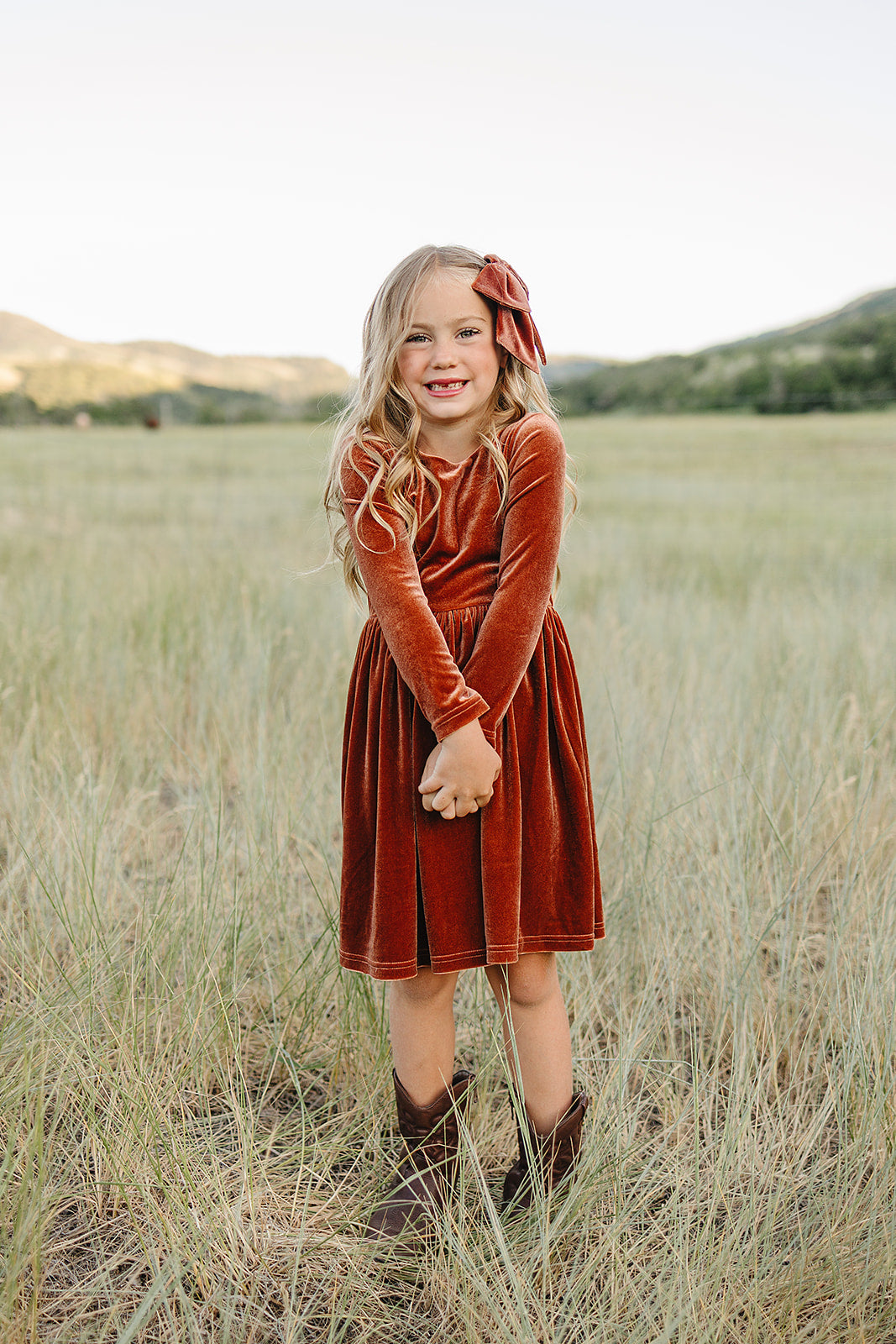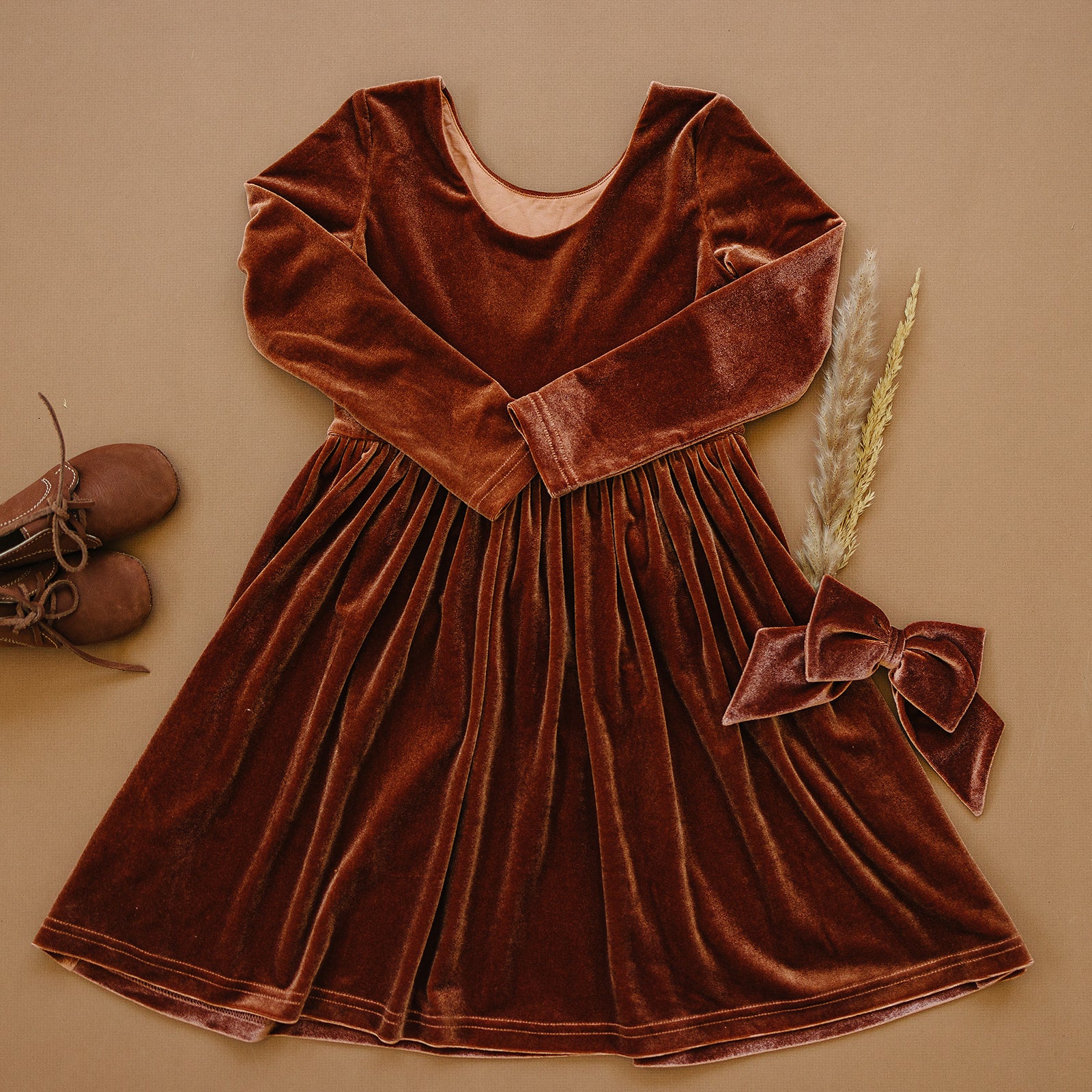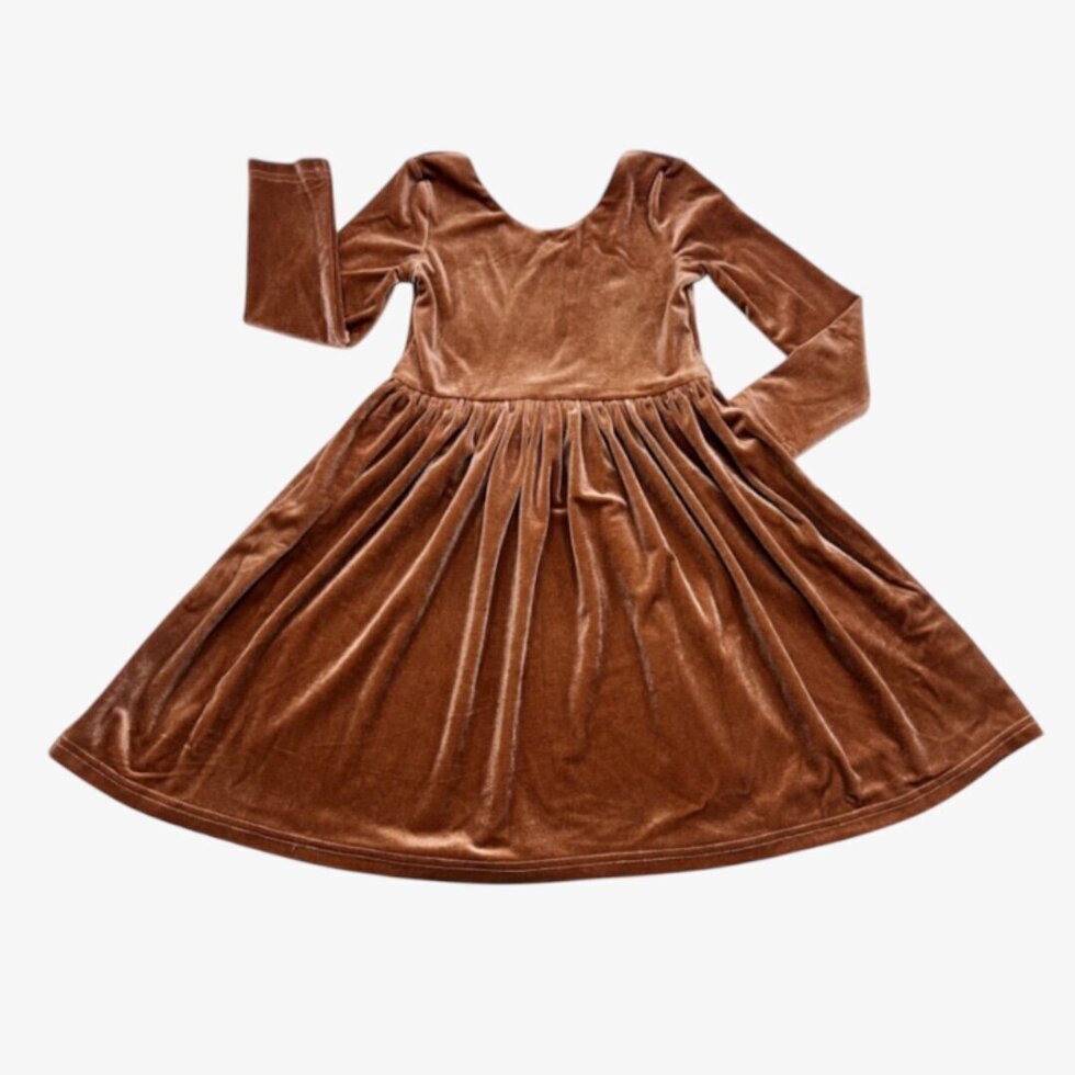 A timeless holiday classic with everyday charm. Our Noel dress in Goldie features a soft stretch velvet in a warm golden-brown hue, perfect for festive gatherings or seasonal photos. Designed with a twirl-worthy skirt, long sleeves, and a comfortable elastic waist, this dress is as cozy as it is elegant.