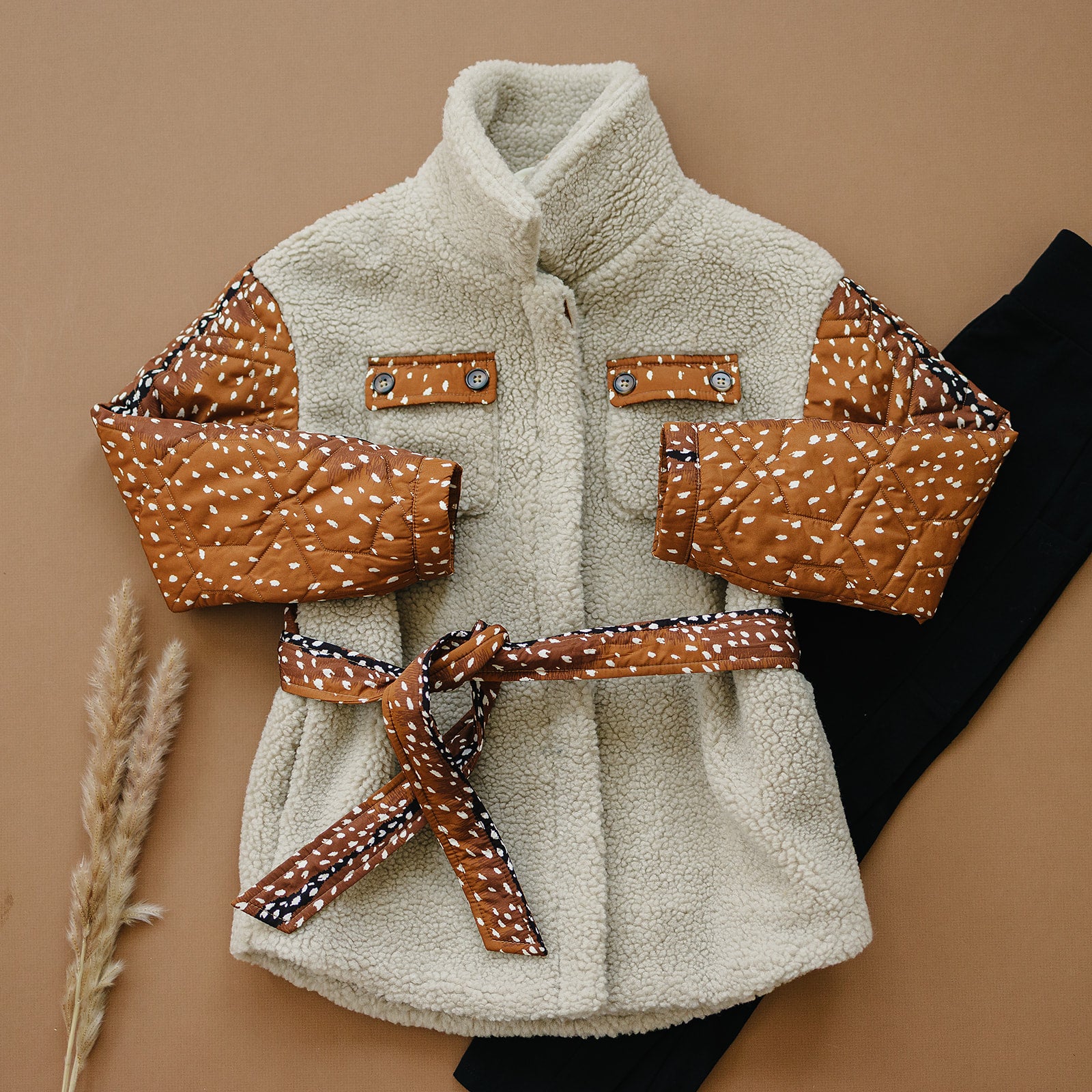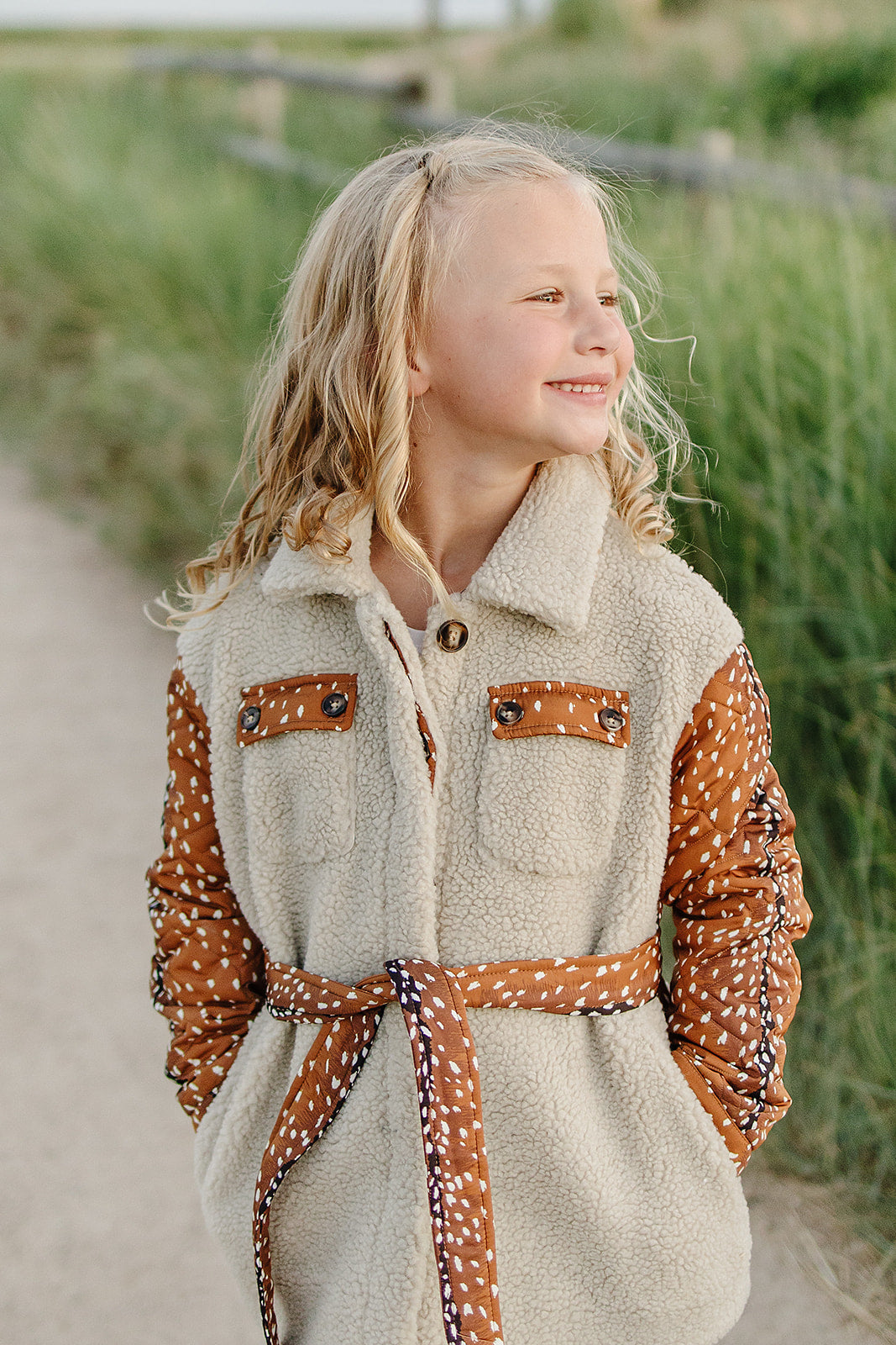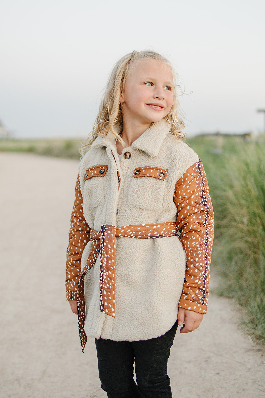 The Reagan Sherpa Quilted Jacket is the perfect mix of cozy warmth and outdoor-inspired style. Designed with ultra-soft sherpa fleece and quilted fawn print panels, this jacket keeps her snug while standing out in the best way. The removable belted waist adds a flattering touch of sophistication, making it versatile enough for school days, holiday outings or crisp fall adventures.