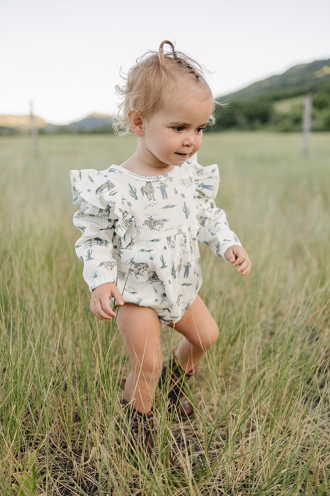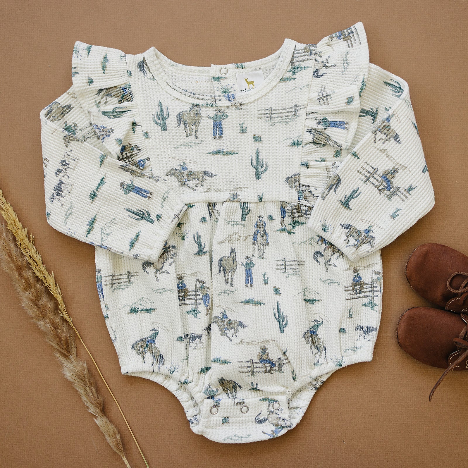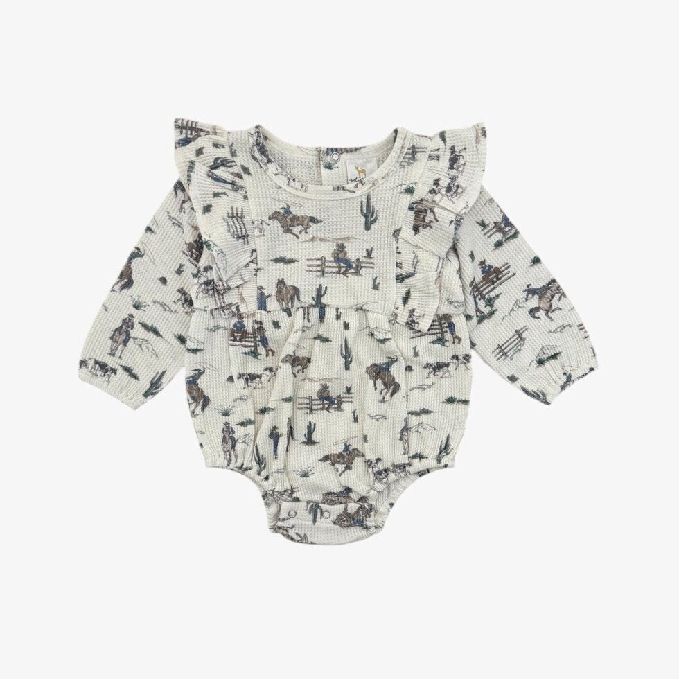 The Vivian Bubble - a perfect harmony of style and comfort. Made of soft waffle knit cotton, this charming bubble features long sleeves and a sweet ruffle detail on the shoulder. In our 'the ranch' all over ranch western print. It brings a playful fresh vibe to your little one's wardrobe.