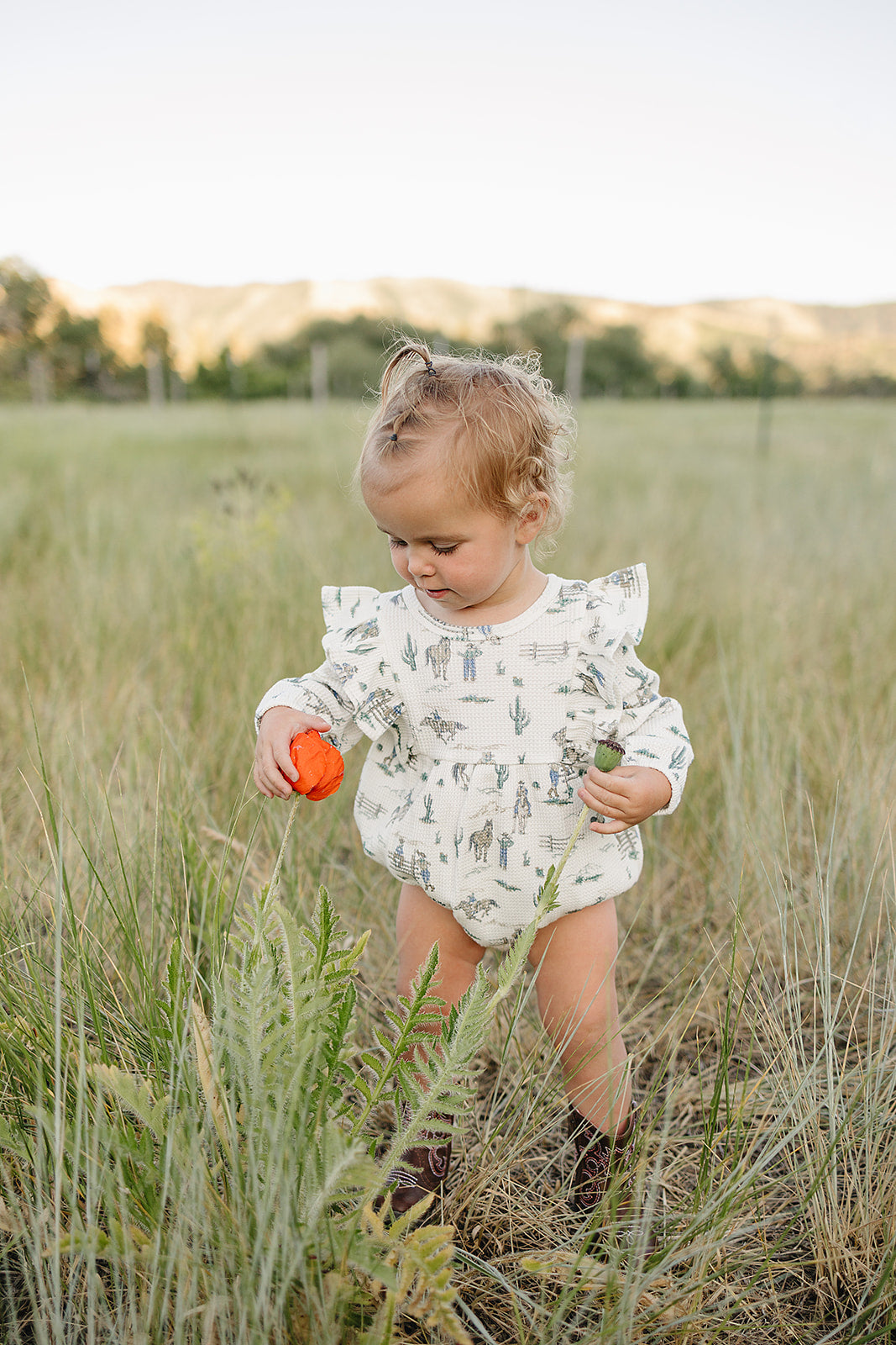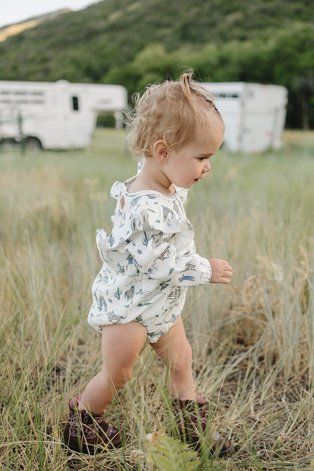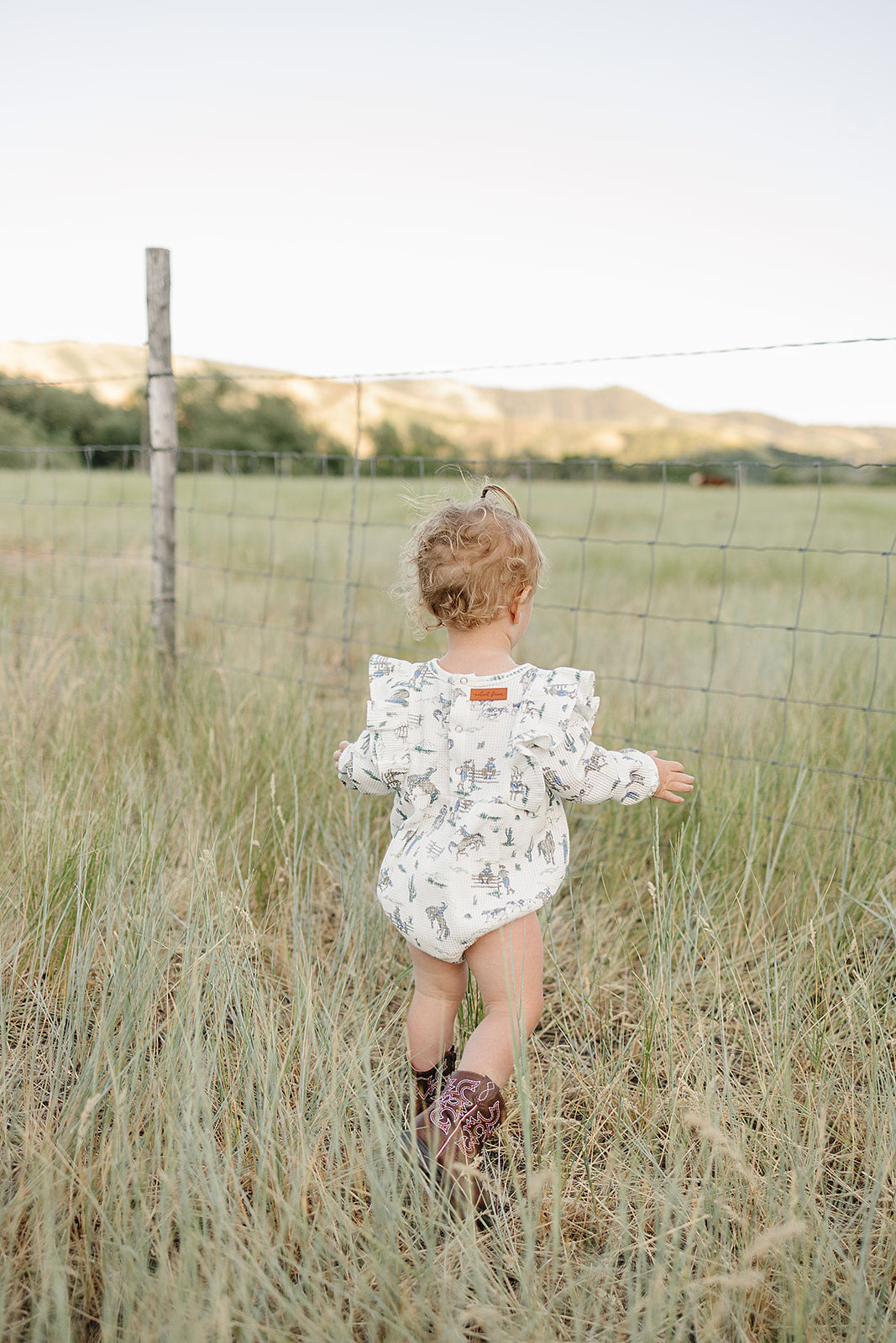The Vivian Bubble - a perfect harmony of style and comfort. Made of soft waffle knit cotton, this charming bubble features long sleeves and a sweet ruffle detail on the shoulder. In our 'the ranch' all over ranch western print. It brings a playful fresh vibe to your little one's wardrobe.