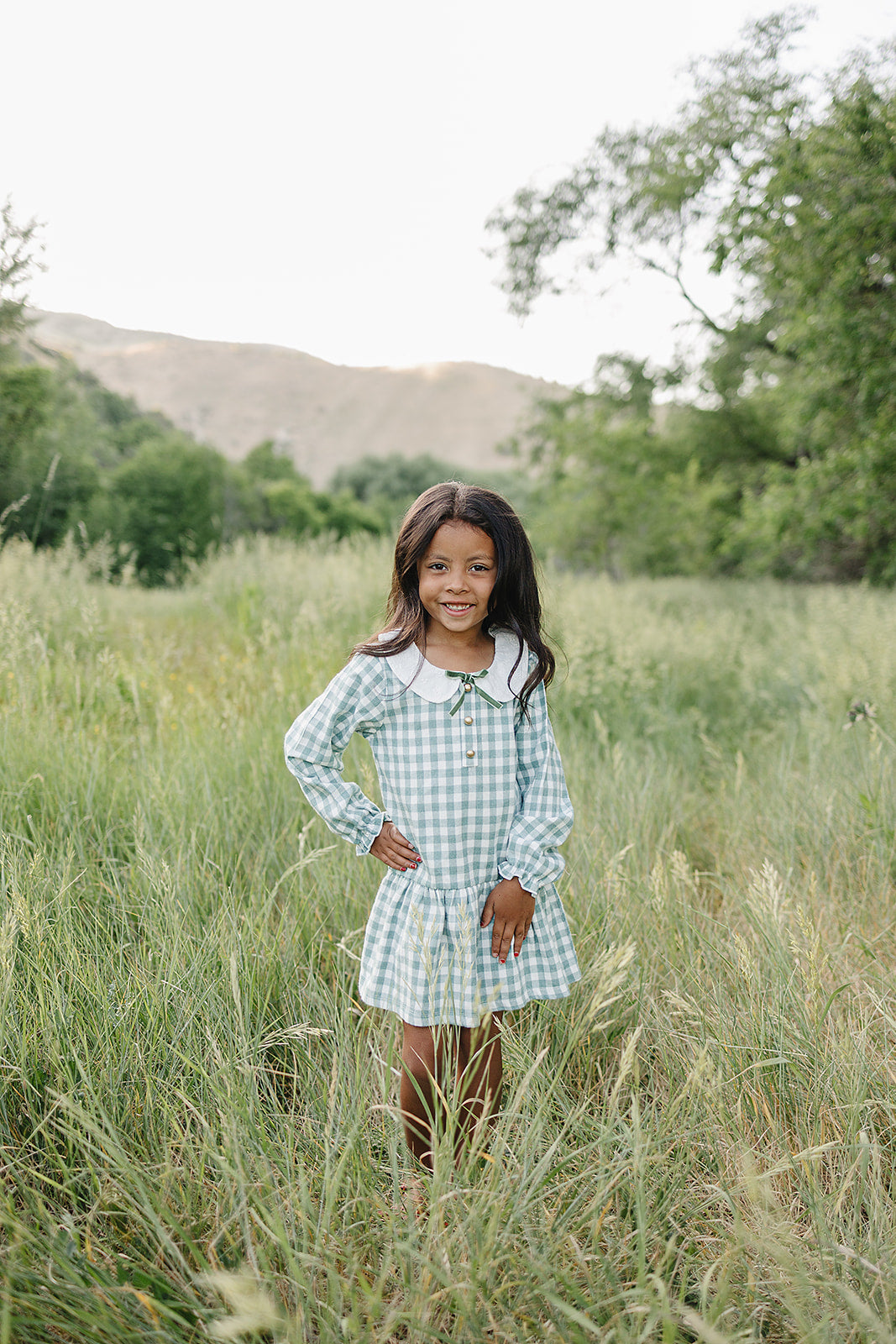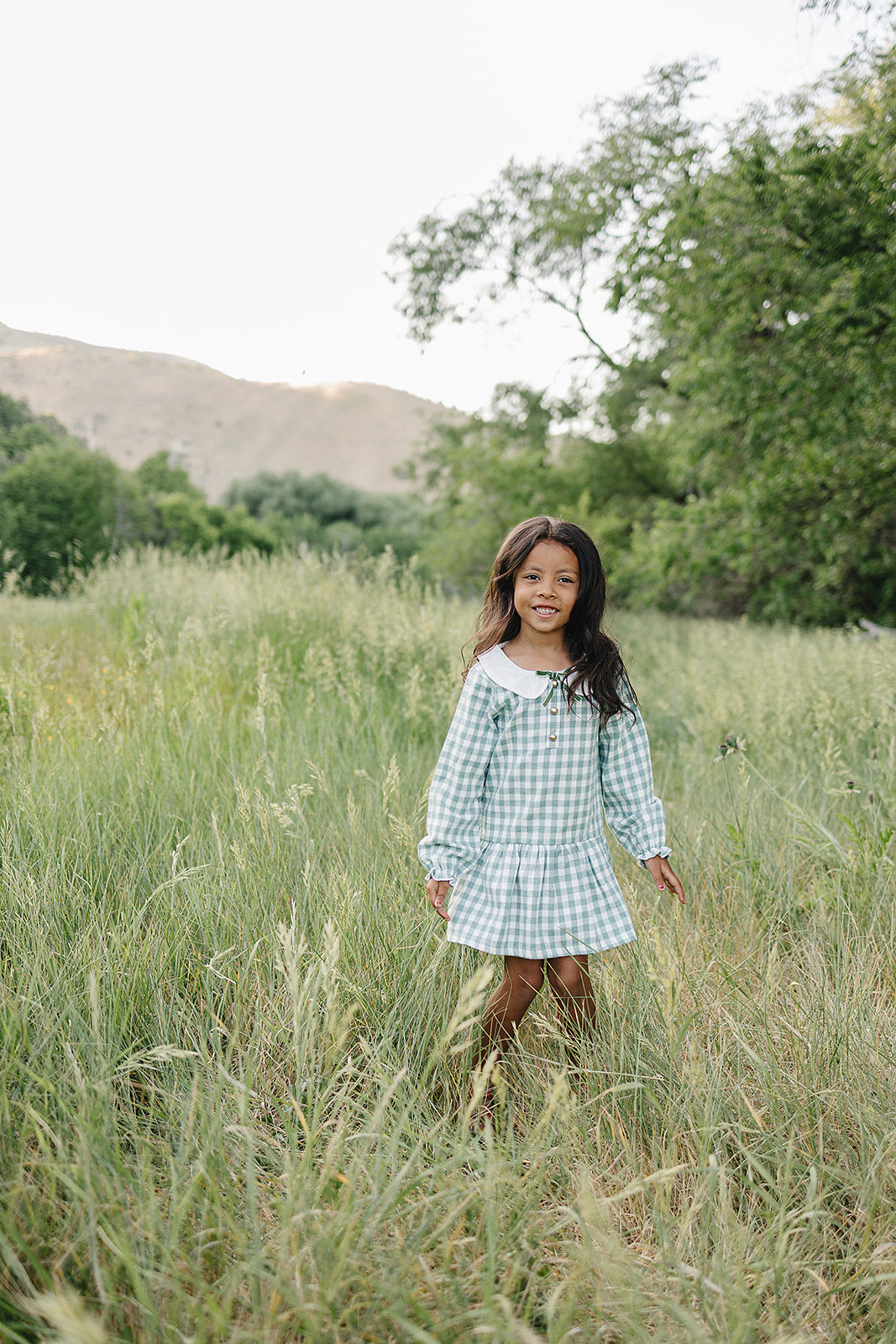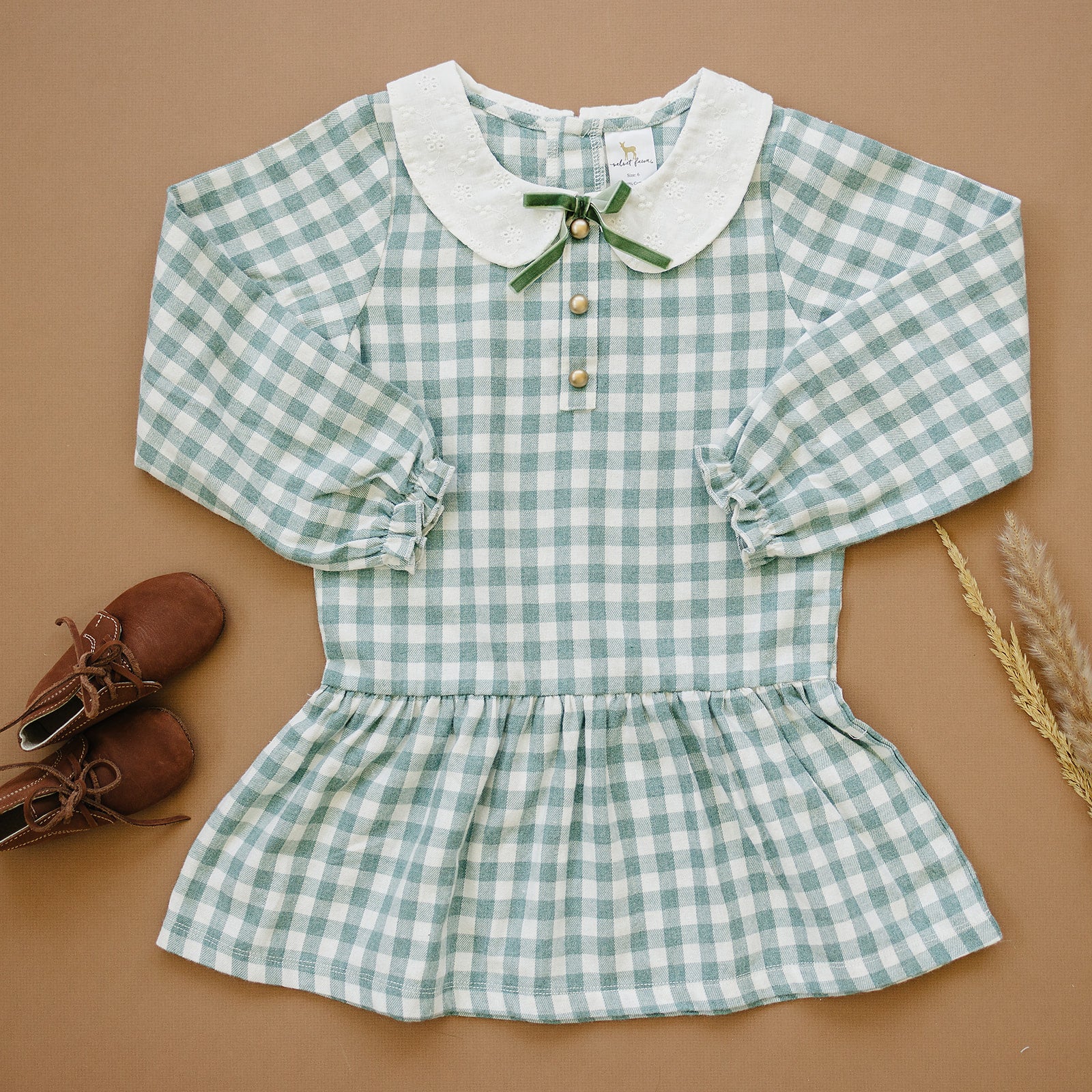 The Wendy Dress- a delightful blend of modern flair and timeless charm. This long sleeve dress with drop hem detail & Peter Pan collar adds a touch of western elegance to your little one's wardrobe.